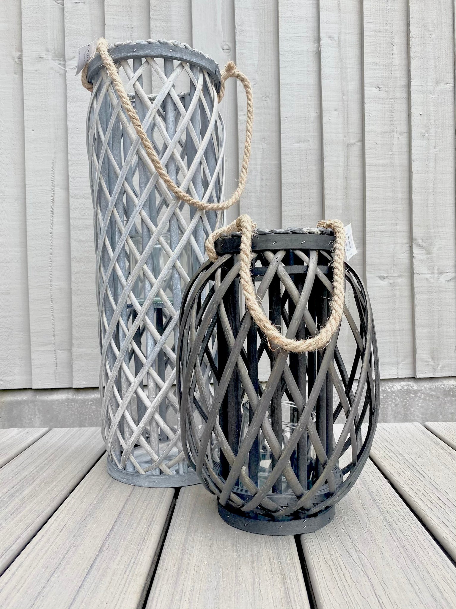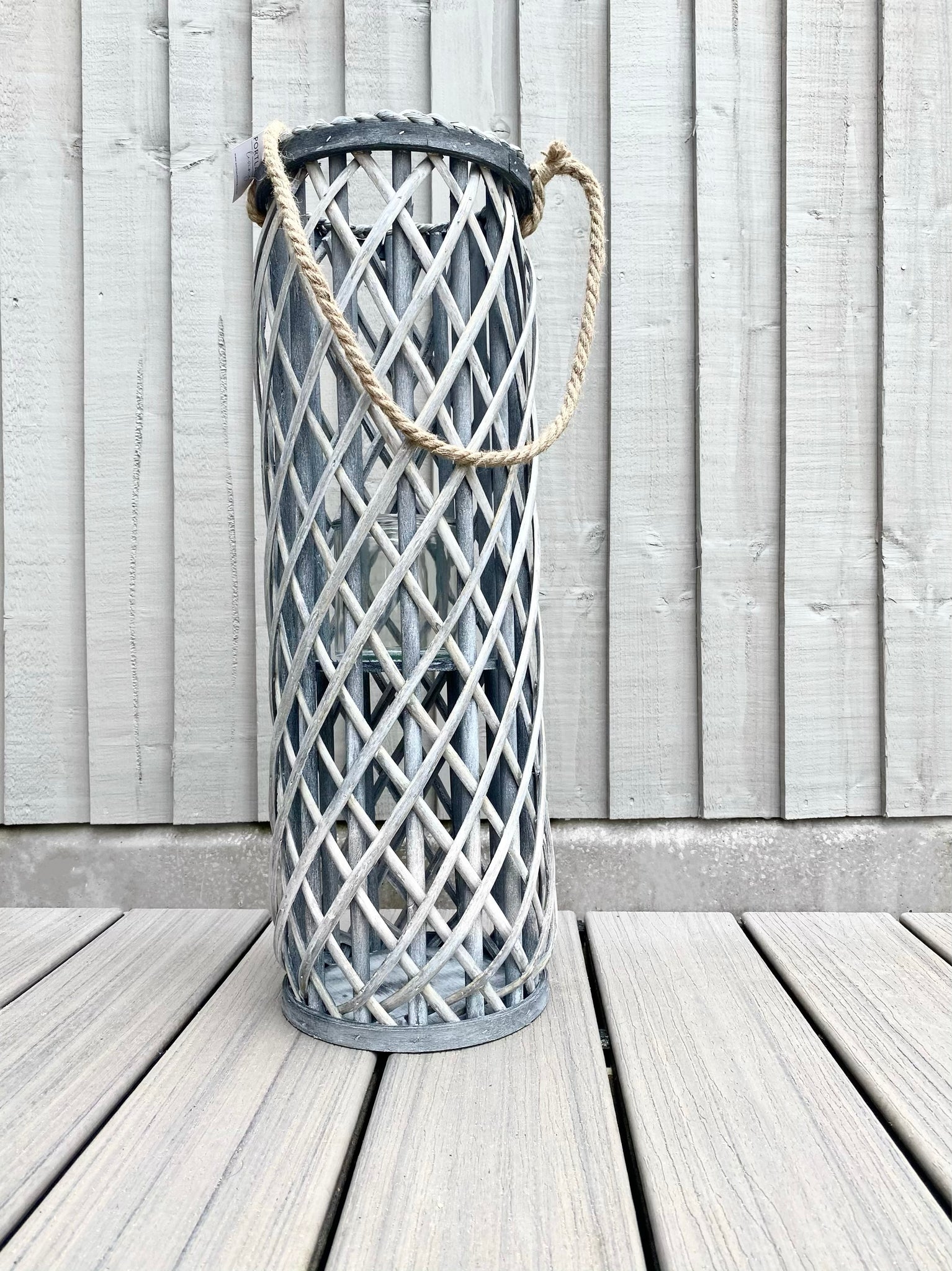 Tall grey woven lantern with chunky rustic rope handle and glass holder inside for candles or LED lights.