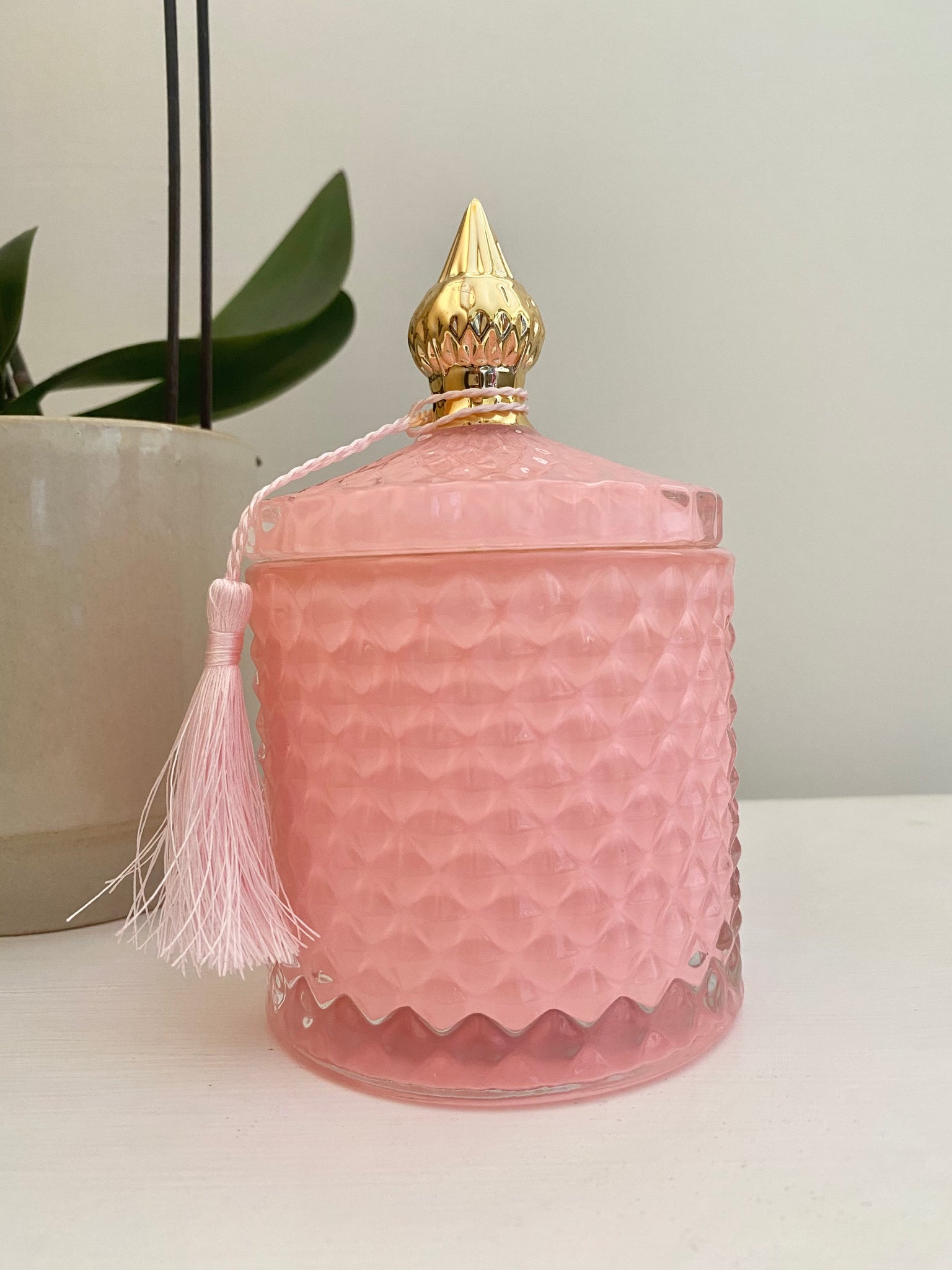 Beautiful scented soy candle in a diamond ridge decorated pot with lid and tassel feature.